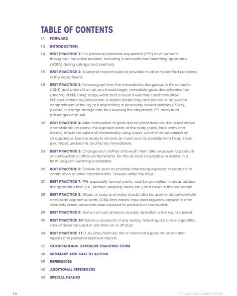 The National Volunteer Fire Council and International Association of Fire Chiefs’ Volunteer and Combination Officers Section released the Lavender Ribbon Report to present 11 specific actions firefighters need to take to lessen their risk of occupational cancer. Make these standard operating procedures in your department.